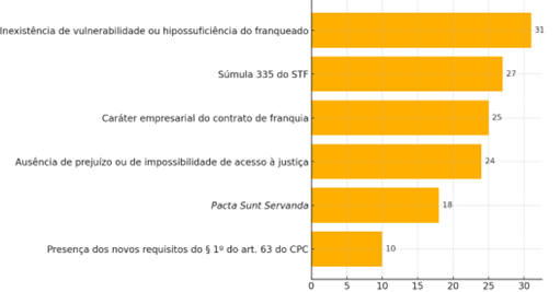 Os principais fundamentos utilizados para reafirmar a validade da cláusula foram: (i) reconhecimento do caráter empresarial do contrato de franquia; e (ii) ausência de prejuízo ou de violação ao acesso à justiça. Apenas 10 dos 51 acórdãos que mantiveram a cláusula de eleição de foro, o fizeram por julgar estarem presentes nas respectivas cláusulas avaliadas os três elementos exigidos pelo § 1º do art. 63.