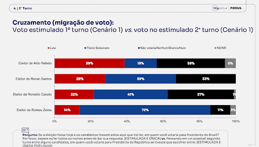 A pesquisa também evidencia a dinâmica de migração de votos entre o primeiro e o segundo turno. Flávio é o principal destino dos eleitores dos demais candidatos alinhados à direita, herdando a maior parte desse contingente. Um destaque é o eleitorado de Romeu Zema (Novo), do qual 72% migram para ele no segundo turno. Entre os eleitores de Ronaldo Caiado, 41% também optam por Flávio, contra 22% que migram para Lula.