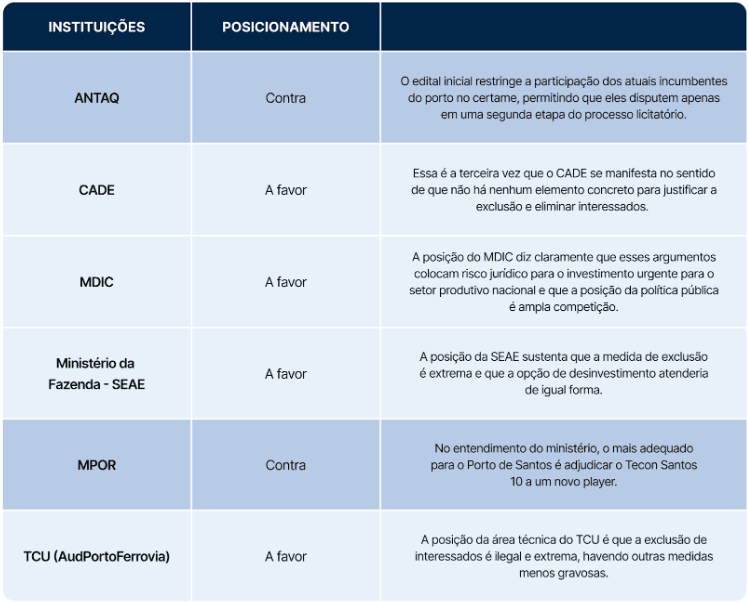 Por sua vez, a manifestação enviada pelo CADE, em questionamento feito também pelo TCU, revela que não existem riscos concorrenciais explícitos que justifiquem, no edital de licitação do Tecon Santos 10 do Porto de Santos, a exclusão das empresas que já tenham terminais no local, conforme o texto do edital de licitação publicado pela ANTAQ.
