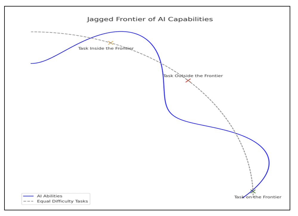 Mas afinal, o que diferencia uma tarefa simples de uma tarefa complexa? Será que podemos utilizar a mesma régua de complexidade que usamos para modelos como o GPT ou o Gemini? A resposta é menos óbvia do que parece. No estudo que citamos de Harvard, os autores apresentam o conceito de “fronteira tecnológica irregular” (jagged frontier), em que a IA se destaca em certas tarefas, mas falha em outras aparentemente semelhantes. Para os economistas de plantão, é como se tivéssemos uma Fronteira de Possibilidades de Produção (FPP) cheia de irregularidades e quinas (vide Figura 2).
