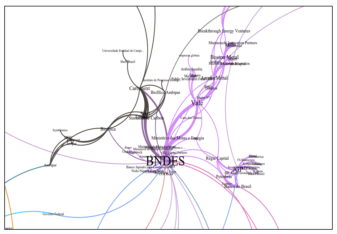 O primeiro protótipo concentrou-se em apenas um veículo de comunicação: após a extração e filtragem de matérias relevantes, o conteúdo foi processado por meio de IA para identificar informações pertinentes ao escopo. O resultado foi um conjunto de 385 notícias que, apesar de algumas duplicações e lacunas, permitiu a construção de um mapa de redes. A análise revelou a formação de clusters distintos e destacou o BNDES como um hub de altíssima centralidade, articulando parceiros de infraestrutura e energia e assumindo um papel estruturante — diferente da lógica mais comercial dos grandes bancos privados no financiamento sustentável.