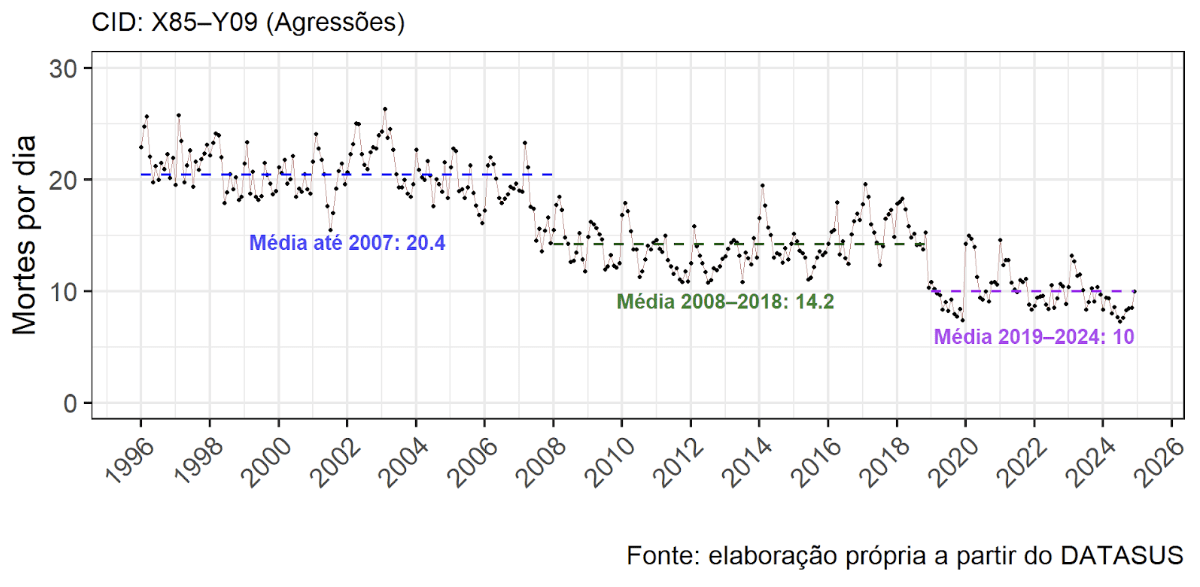 Figura 3: Média diária de mortes por agressão no Rio de Janeiro (1996-2025)