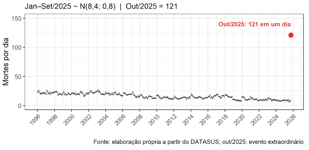 O resultado, destacado em vermelho na Figura 3, mostra o tamanho do colapso: um evento totalmente fora da curva em termos estatísticos. Em outubro de 2024, segundo estimativas do Datasus, o Rio de Janeiro registrou 263 óbitos por agressão. Isso equivale a dizer que, em 28 de outubro de 2025, morreram em apenas um dia quase tantas pessoas quanto em cerca de 15 dias do mesmo mês no ano anterior.
