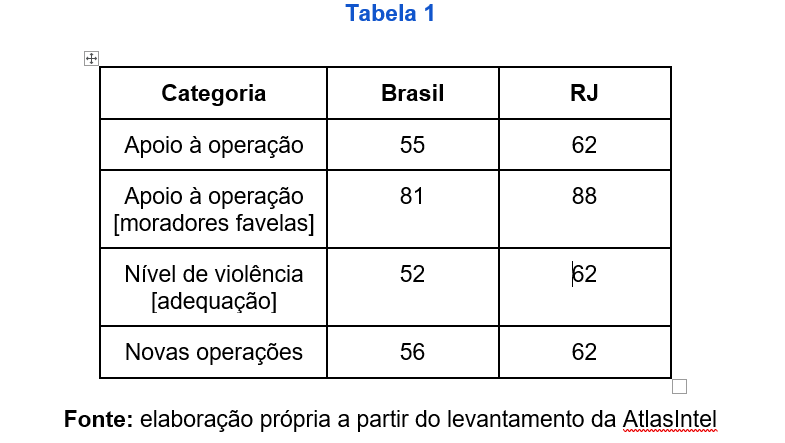 A tabela mostra como o Rio de Janeiro se destaca, em relação ao restante do país, pelo alto grau de apoio popular às operações policiais, mesmo quando estas envolvem níveis elevados de violência. Enquanto no Brasil 55% da população apoiam esse tipo de ação, no Rio o índice sobe para 62%. Entre moradores de favelas, onde as operações tendem a ser mais frequentes e letais, o apoio é ainda maior: 88%, contra 81% na média nacional.